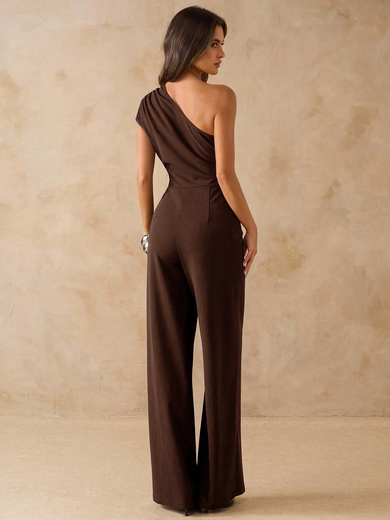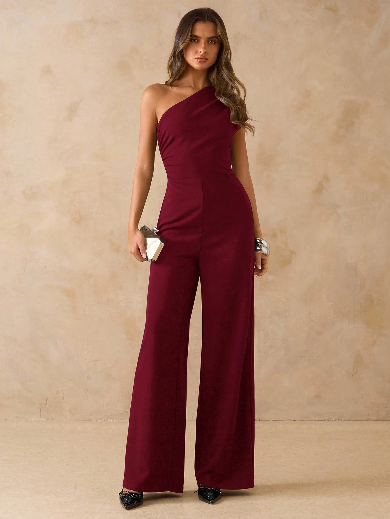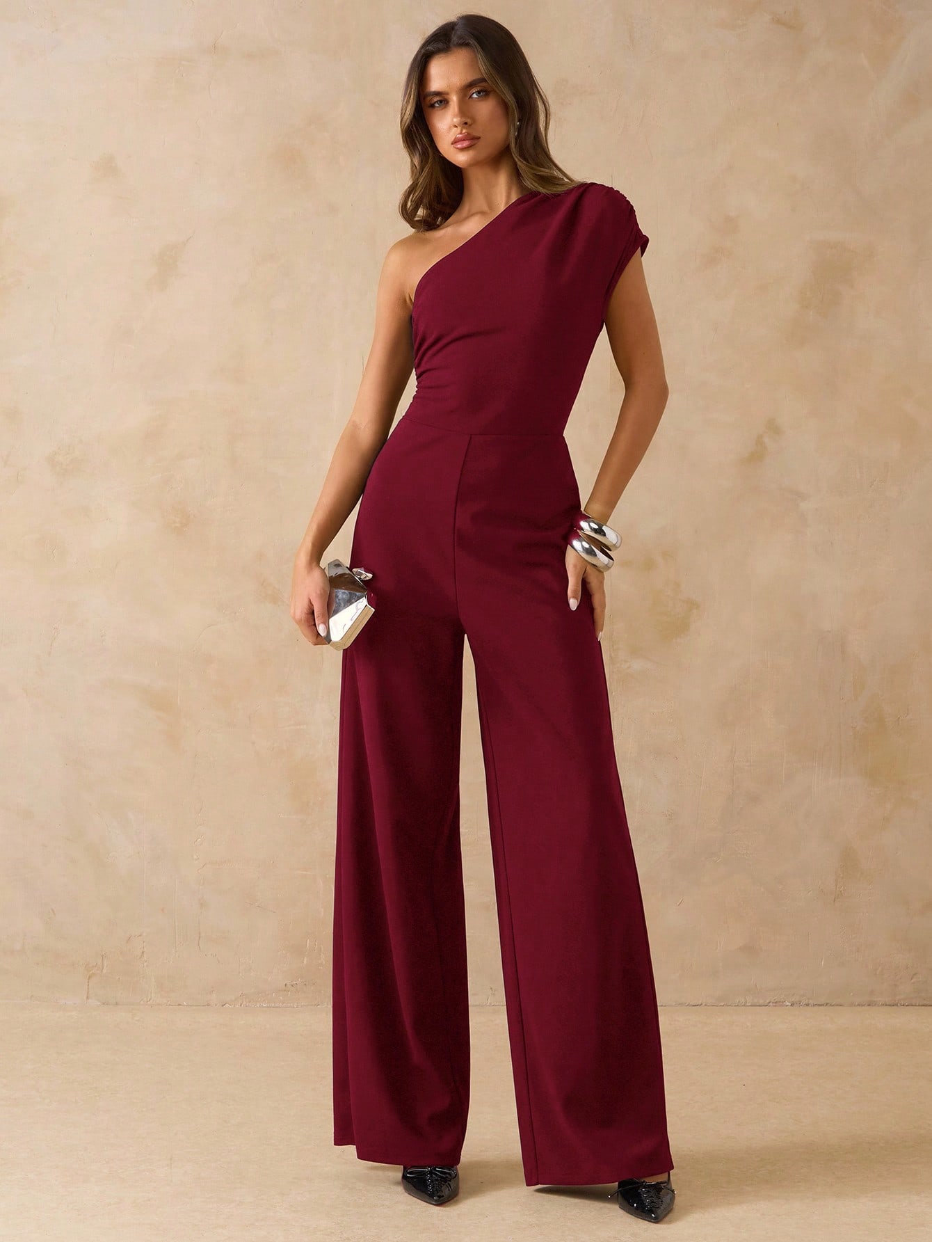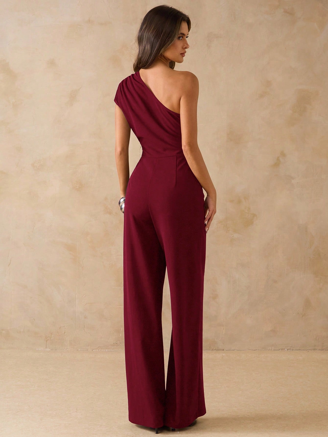 Asymmetrical Shoulder Fitted Wide Leg Jumpsuit