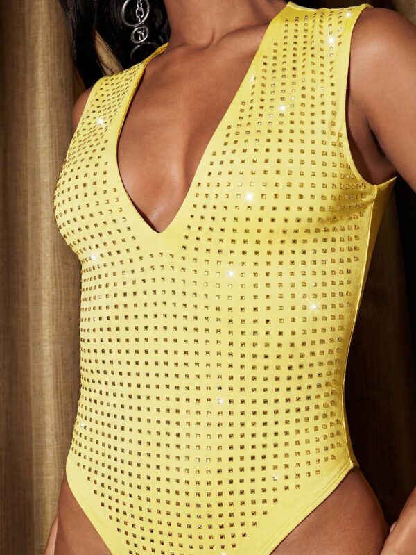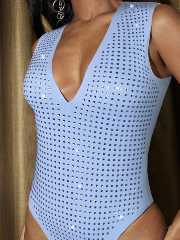 Elegant Square Rhinestone Deep V Neck Bodysuit