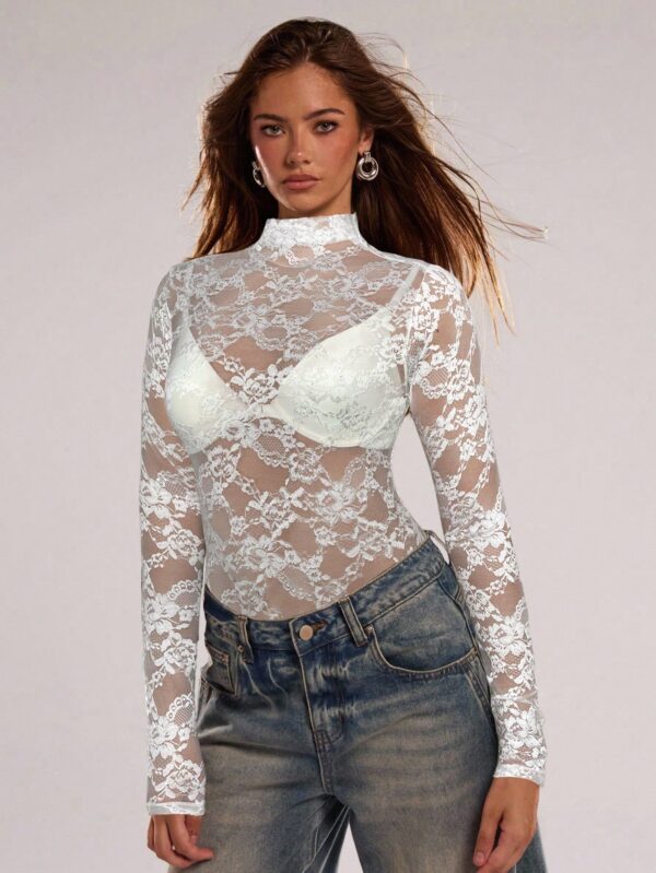 Floral Lace Long Sleeve Sheer Bodysuit | Voile et lumiere | Online Store