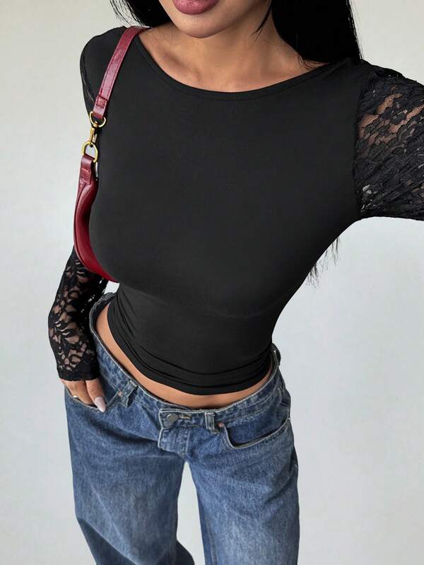 Lace Backless Crew Neck Long Sleeve Knit Top