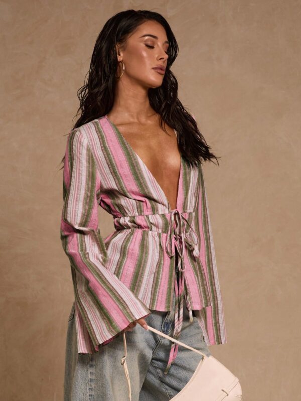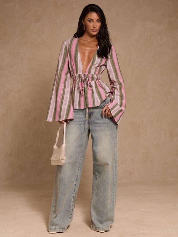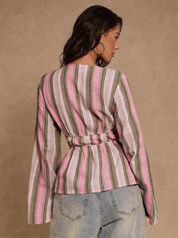 Striped Deep V-Neck Flare Sleeve Shirt