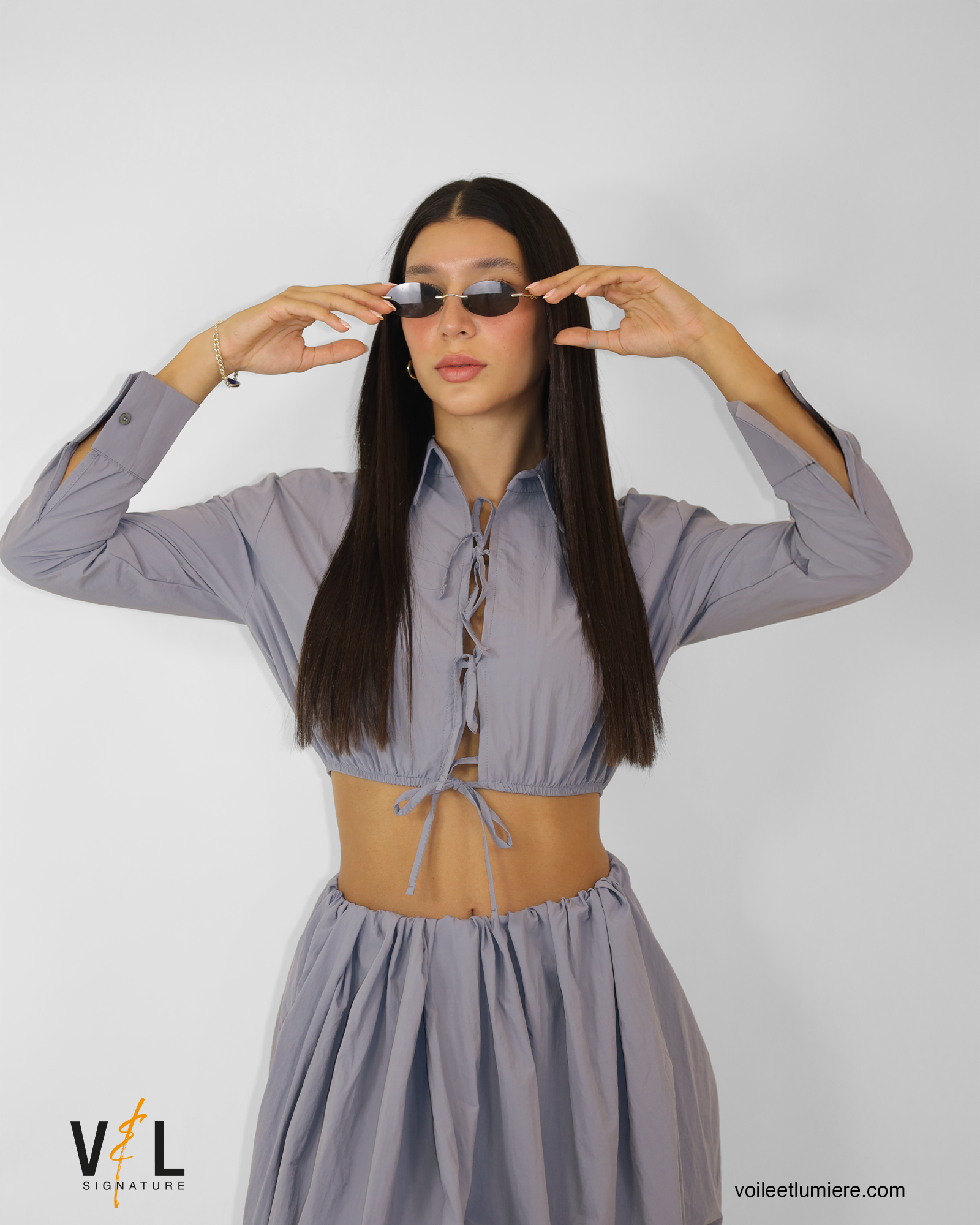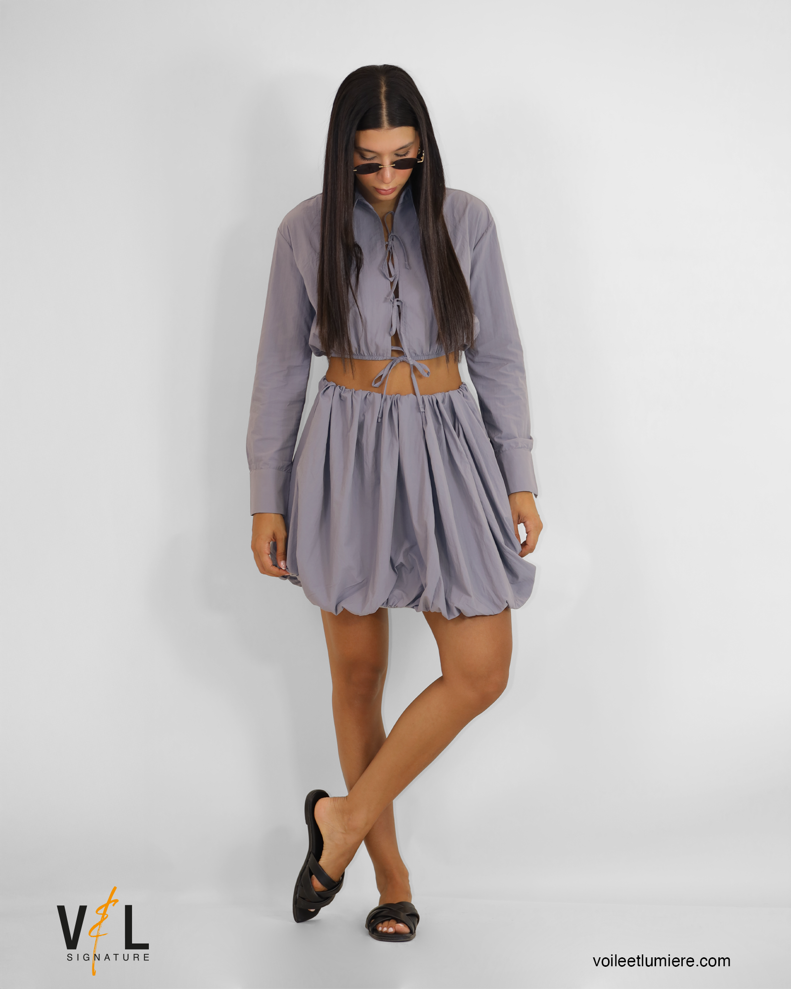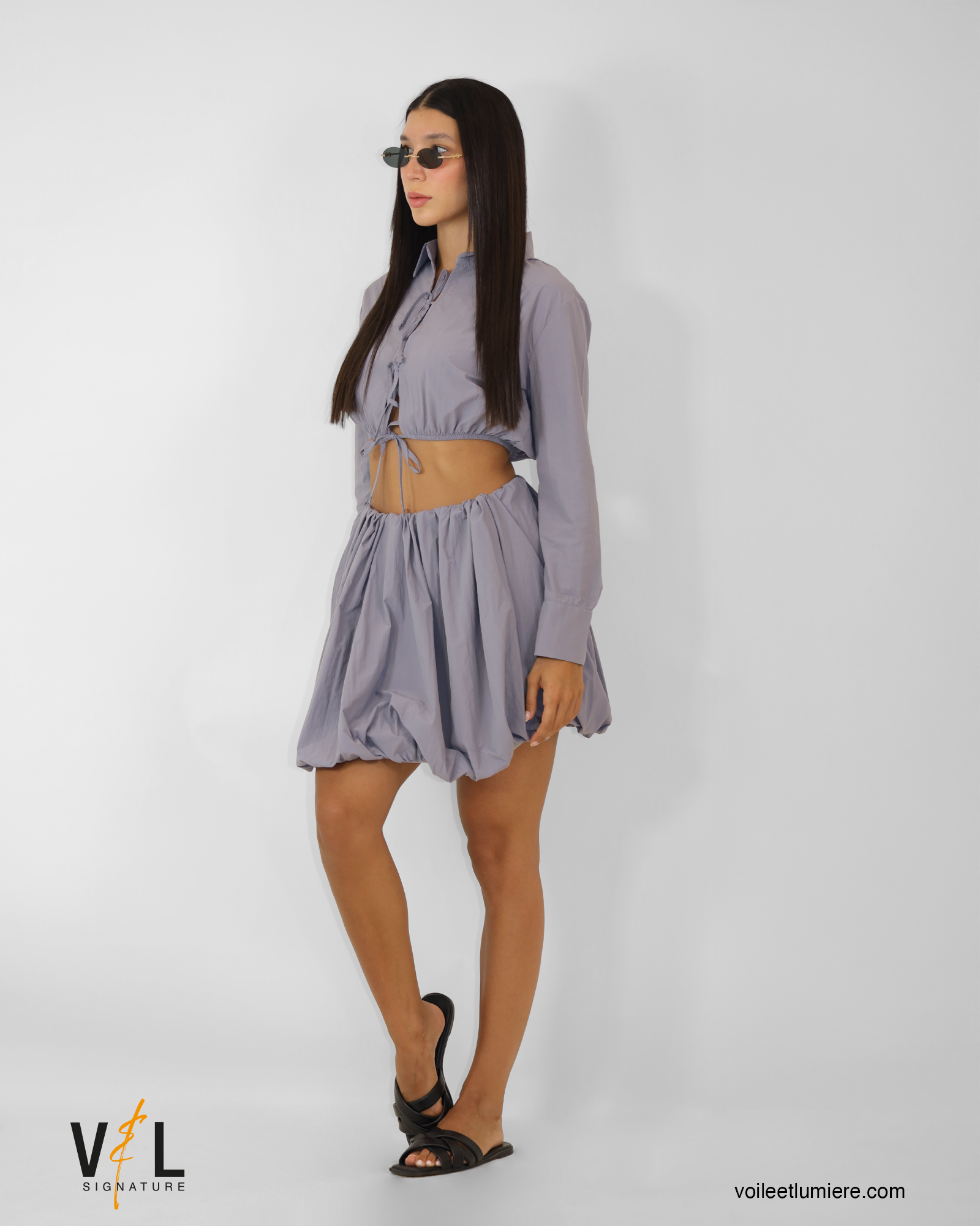 Stylish Front Tie Long Sleeve Crop Top & Bubble Skirt Set quantity